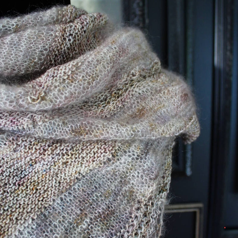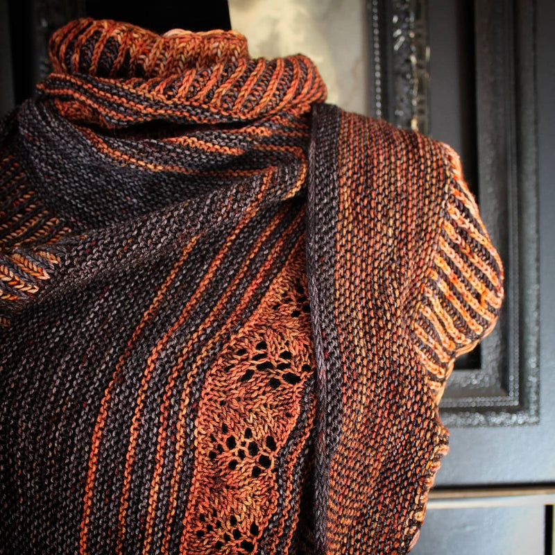 Detail of our "Shake it Up Shawl," designed by Anna Johanna, using Tralala Sock in "The Black Shuck," "Wasteland," and "Roobios."